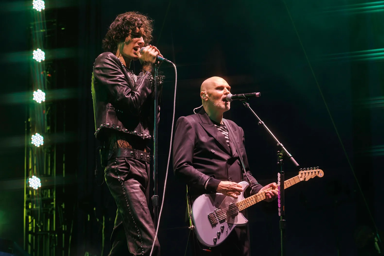 His sleek sunglasses and a bedazzled “77” detail on the jacket added a rockstar touch, perfectly matching his high-energy stage presence and giving fans major concert-style inspiration.