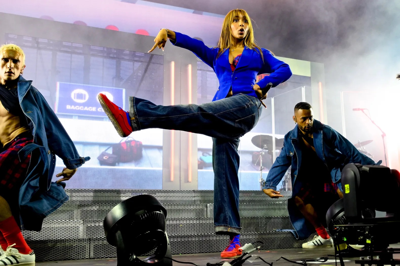 PinkPantheress brought a unique mix of office-core and rave fashion. She wore an oversized cobalt blue blazer, creating a strong structured look that stood out in the desert setting.