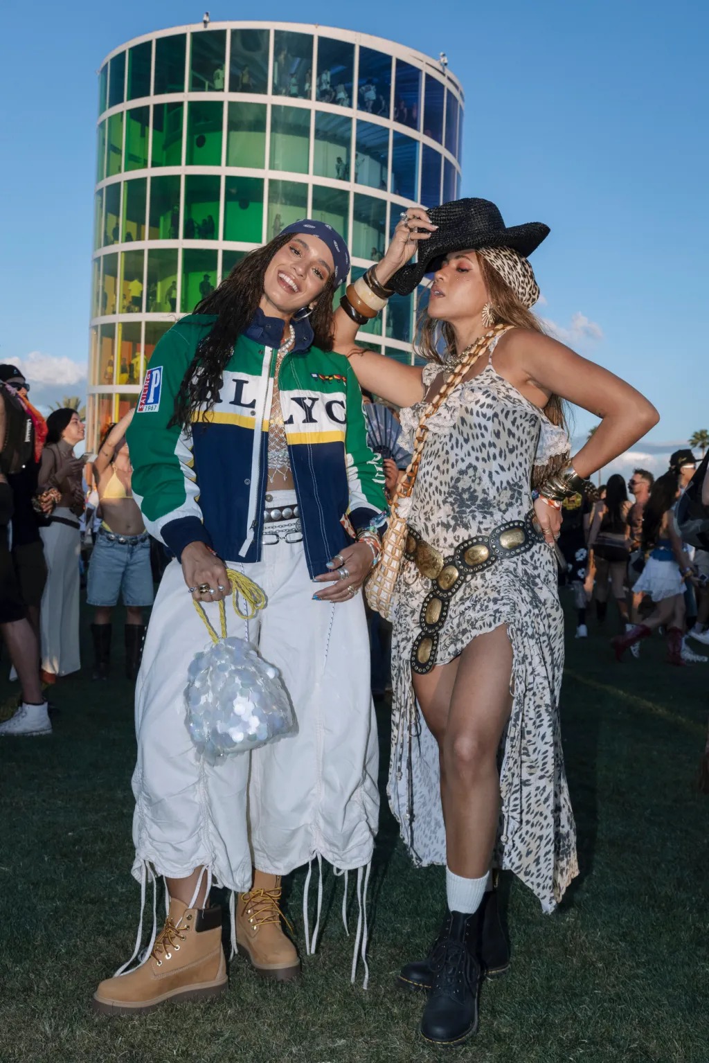 Hailey Grice wore a desert-bohemian festival outfit consisting of a white lace corset-style top and matching white lace micro shorts. Princess Nokia wearing a green, white, and navy vintage-style "POLO" racing jacket paired with oversized white cargo pants and classic tan work boots.