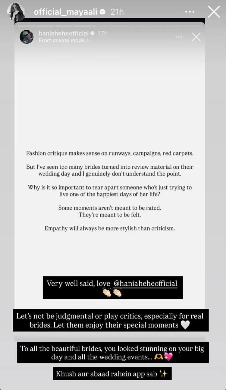 Hania took to Instagram stories, stating, “Fashion critique makes sense on runways, campaigns, red carpets. But I’ve seen too many brides turned into review material on their wedding day, and I genuinely don’t understand the point.”