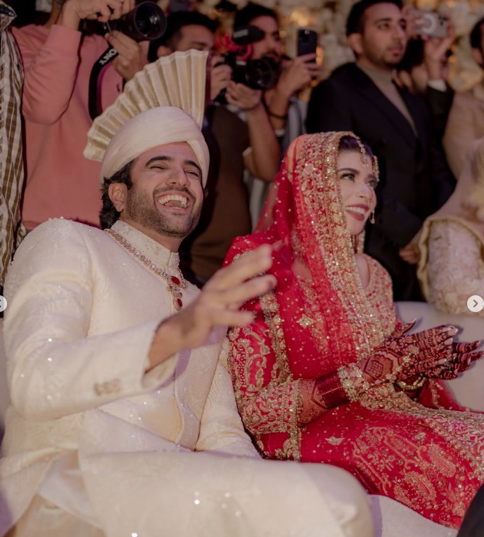 Fashion was another highlight of the Umer Aalam barat. The groom chose an elegant off-white sherwani paired with a qulla, while bride Fiza Umer stunned in a deep red lehenga decorated with fine dabka and tilla work, completed with classic gold jewellery.