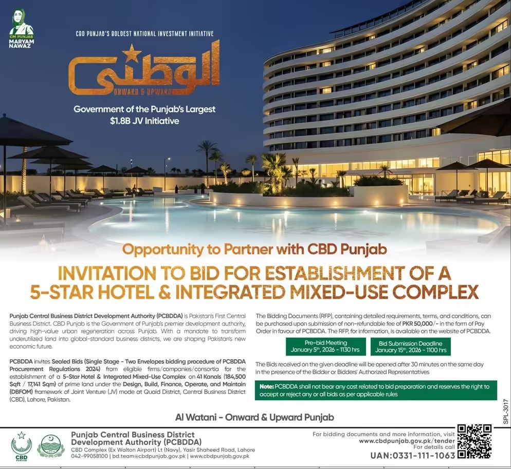 The Punjab Central Business District Development Authority (PCBDDA) launched the international bidding process for a world-class five-star hotel and mixed-use complex in CBD Punjab Quaid District. The project covers 41 kanals of prime commercial land and aims to become the country’s largest integrated hospitality and commercial development.