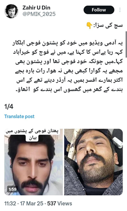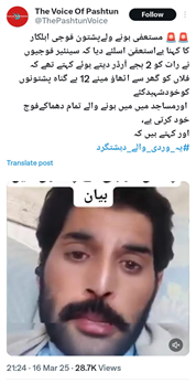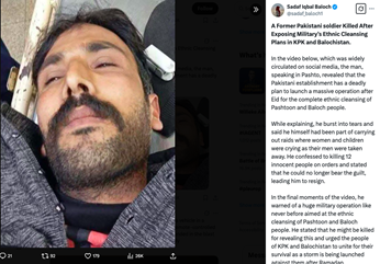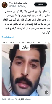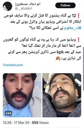 In his video statement, he claimed to have killed 12 civilians on the orders of his superiors. The video was widely circulated by pro Pashtun Tahafuz Movement (PTM) and Baloch separatist social media activists (SMAs), who later alleged that the soldier was assassinated by intelligence agencies for exposing military actions.