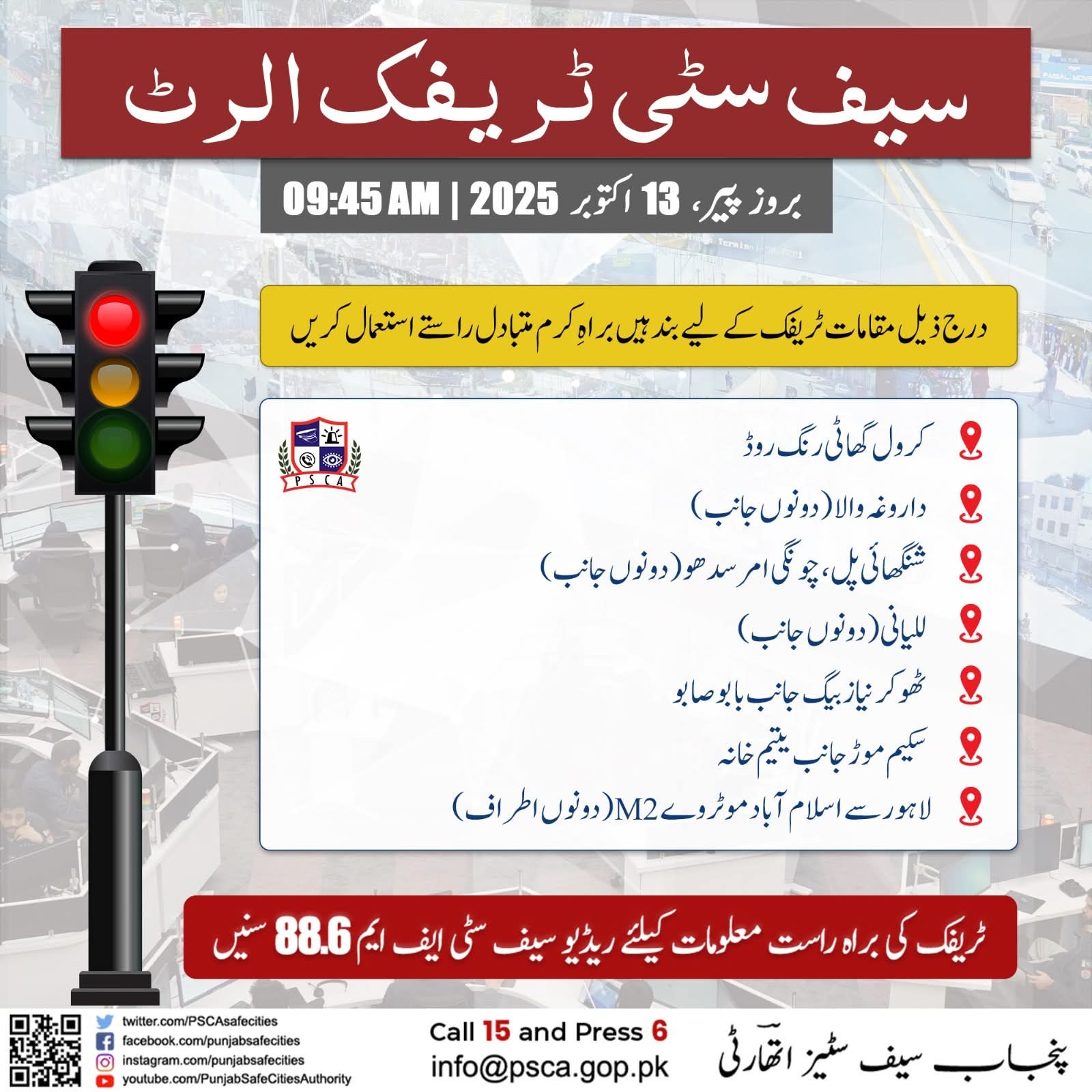 According to the Motorway Police, the Lahore–Islamabad Motorway (M-2) has been closed for all traffic, with the Baboo Sabu Interchange also sealed off. Entry routes from Thokar Niaz Baig towards the motorway remain blocked, while heavy traffic congestion has been reported on Multan Road, Yateem Khana Chowk, and Chungi Amar Sidhu.