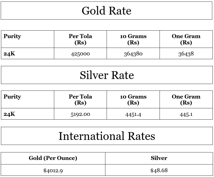 The gold price in Pakistan reached Rs 425000 per tola on Friday, following a fresh jump in international markets. According to the latest data, 10 grams of 24-karat gold are now priced at Rs 364380, while one gram costs Rs 36438.