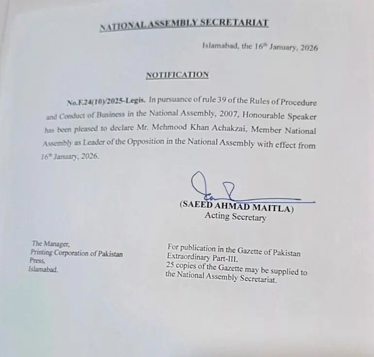 After the approval, PTI Chairman Barrister Gohar and senior leader Aamir Dogar were called to the Speaker’s chamber. A PTI delegation met the Speaker and received the formal notification confirming Achakzai’s new role.