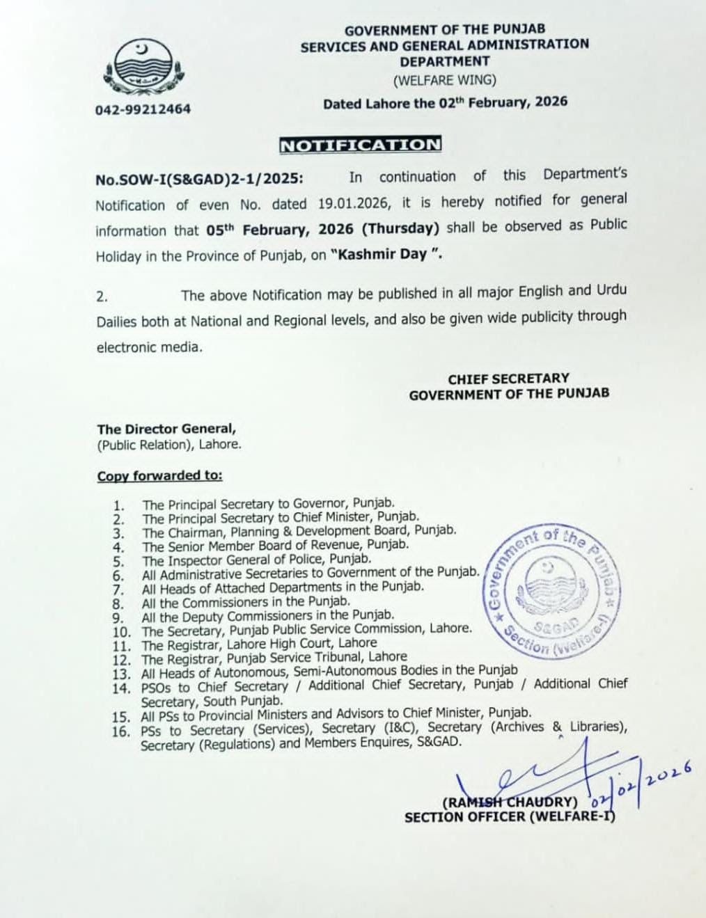 The Punjab government has officially declared February 5, 2026, as a public holiday across the province to observe Kashmir Solidarity Day, according to a notification issued by the Services and General Administration Department (S&GAD).