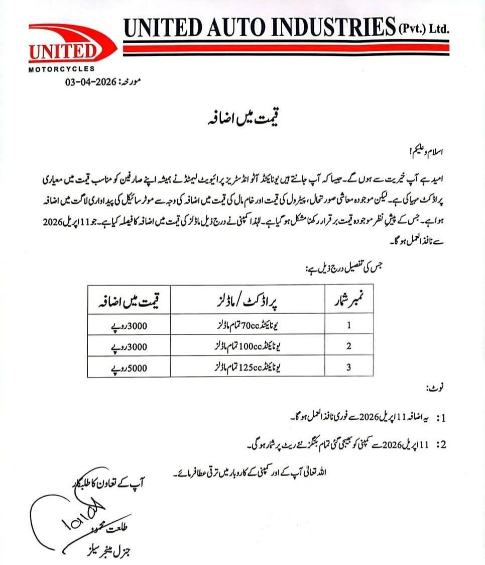 United Auto Industries has announced an increase in motorcycle prices by Rs3,000 to Rs5,000, effective from April 11, 2026, according to an official notification issued by the company.