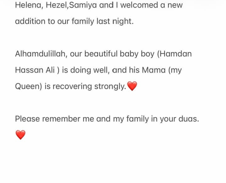 Hassan Ali expressed gratitude to Allah and said becoming a father again is a special moment for him and his family. He added that little Hamdan Hassan Ali is healthy, and his wife is recovering strongly after the delivery.
