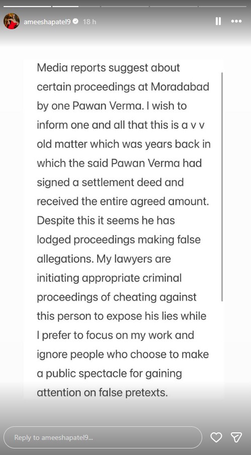 Responding to the media buzz, Ameesha clarified the situation on Instagram. She called the allegations false and stated that the case had already been settled.