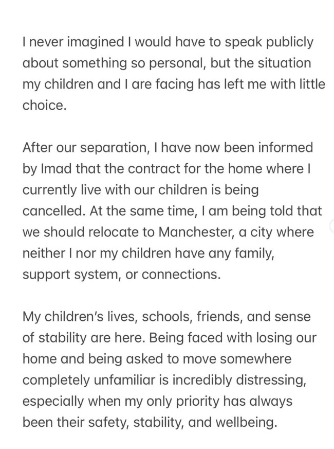 Imad Wasim’s team allegedly informed her that the home contract is ending and she must relocate to Manchester.