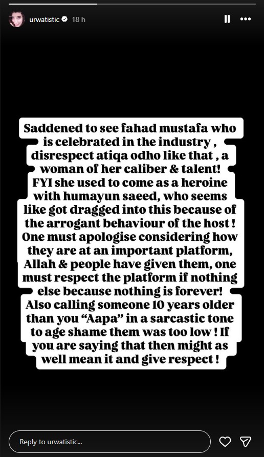 In her Instagram story, Urwa said she felt hurt seeing a respected star speak that way about a woman known for her talent and grace.