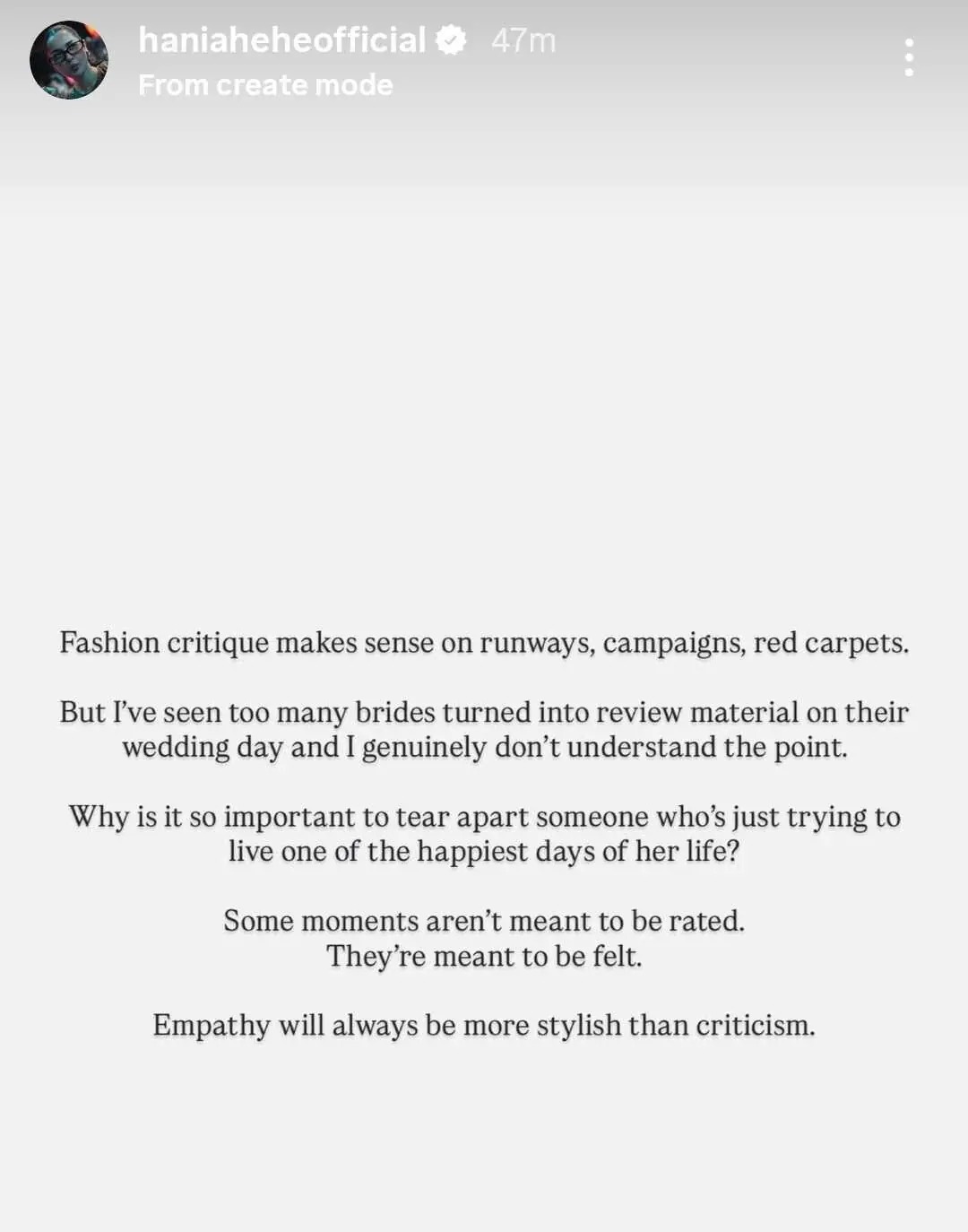 Hania took to Instagram stories, stating, “Fashion critique makes sense on runways, campaigns, red carpets. But I’ve seen too many brides turned into review material on their wedding day, and I genuinely don’t understand the point.”