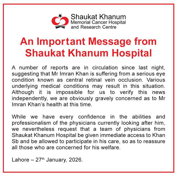 The statement was issued from Lahore on 27 January 2026 and has drawn wide public attention, with many calling for clarity on Imran Khan’s health situation.